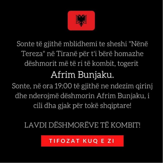 Edhe në Tiranë, sot në orën 19:00 tek sheshi “Nënë Tereza” do të mbahen homazhe për të ndjerin Bunjaku.